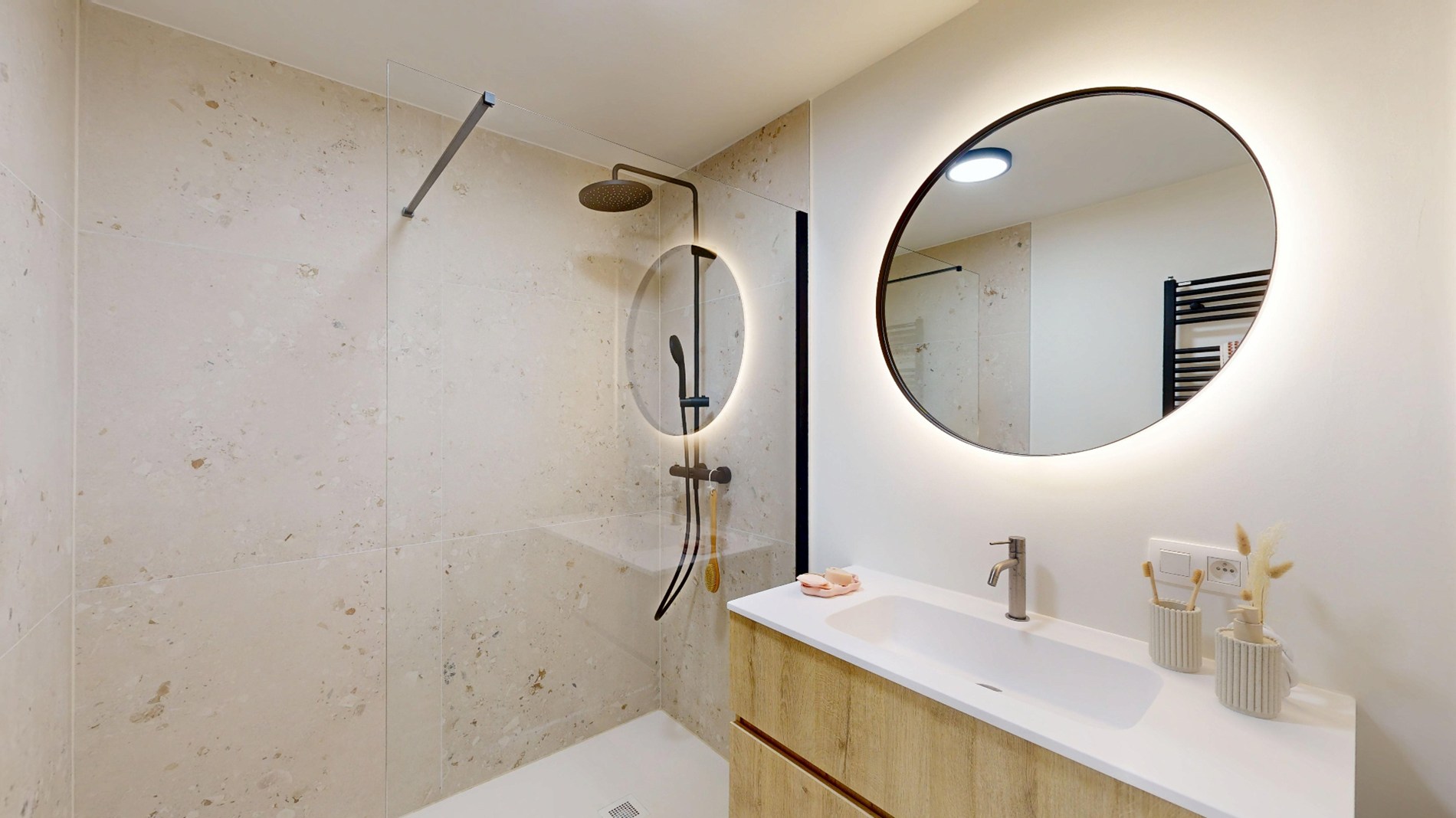 The apartment has three spacious bedrooms, ideal for a family or guests. The bathroom is equipped with all comforts and is equipped with a shower, sink, and toilet.
