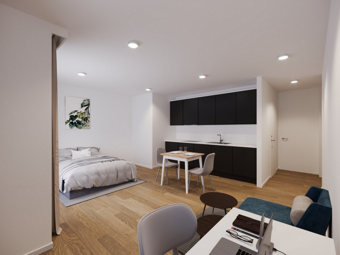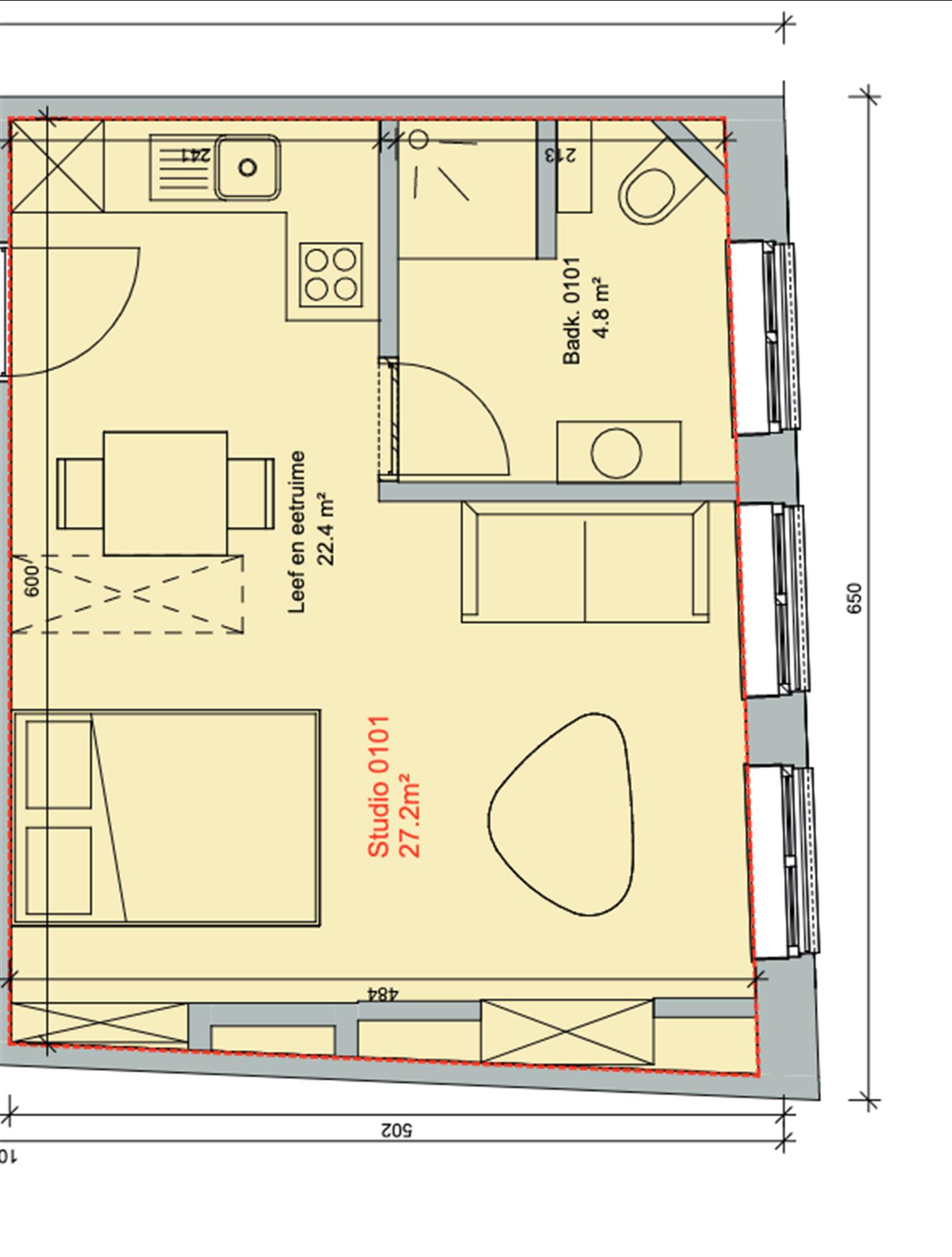 De bewoonbare oppervlakte van 27.20 vierkante meter is slim ingedeeld, waardoor elke centimeter optimaal benut wordt. De studio beschikt over een open keuken met alle nodige toestellen, een gezellige zithoek, een comfortabel bed en een aparte badkamer met douche, wastafel en toilet.