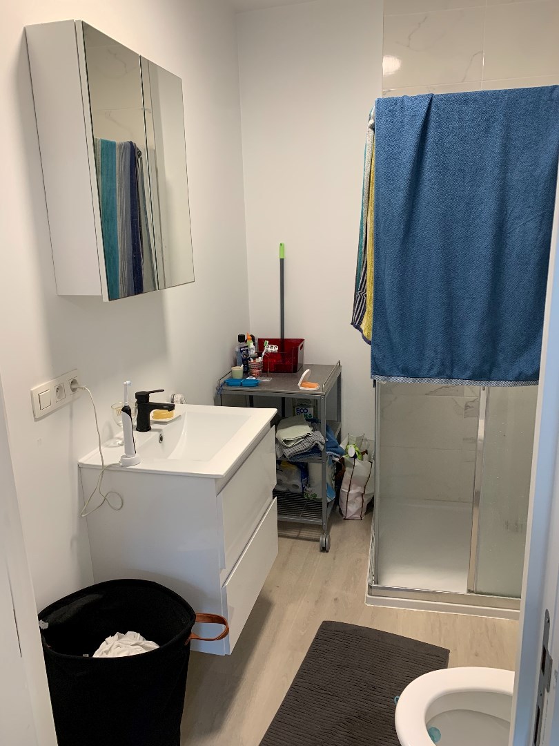 De badkamer is modern en beschikt over een douche, wastafel en toilet.