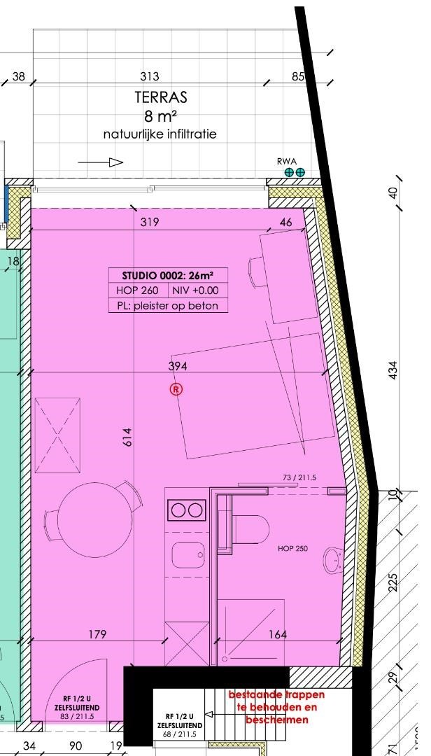 Met een bewoonbare oppervlakte van 26.00 vierkante meter biedt deze studio voldoende ruimte. De open woonkamer en keuken creëren een gezellige sfeer, terwijl de grote ramen zorgen voor veel natuurlijk licht.