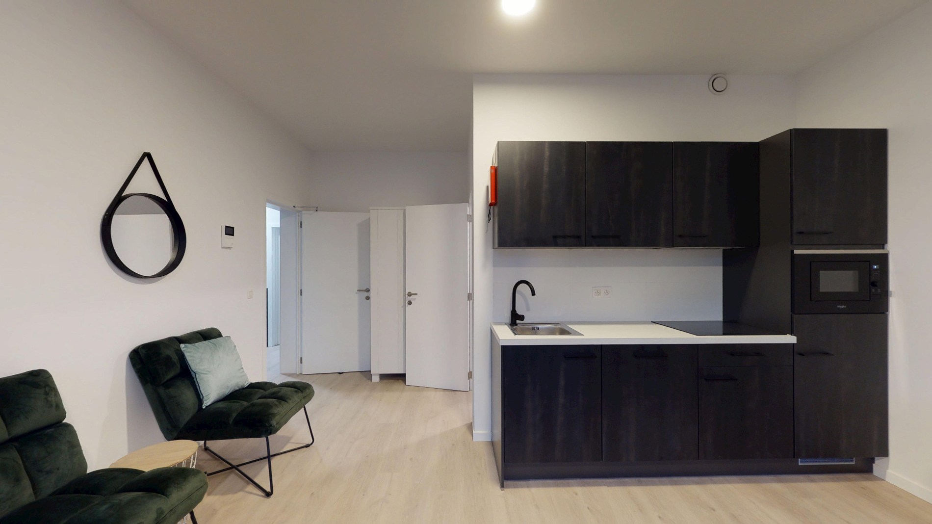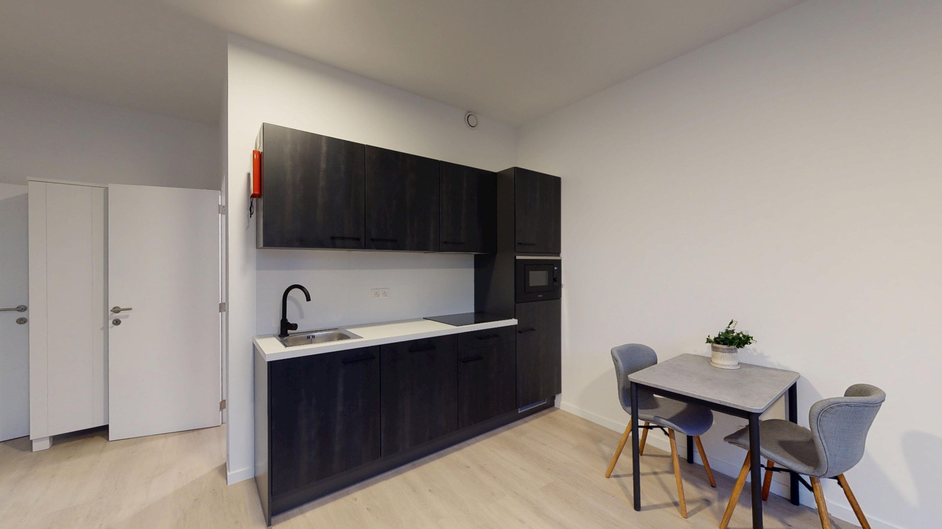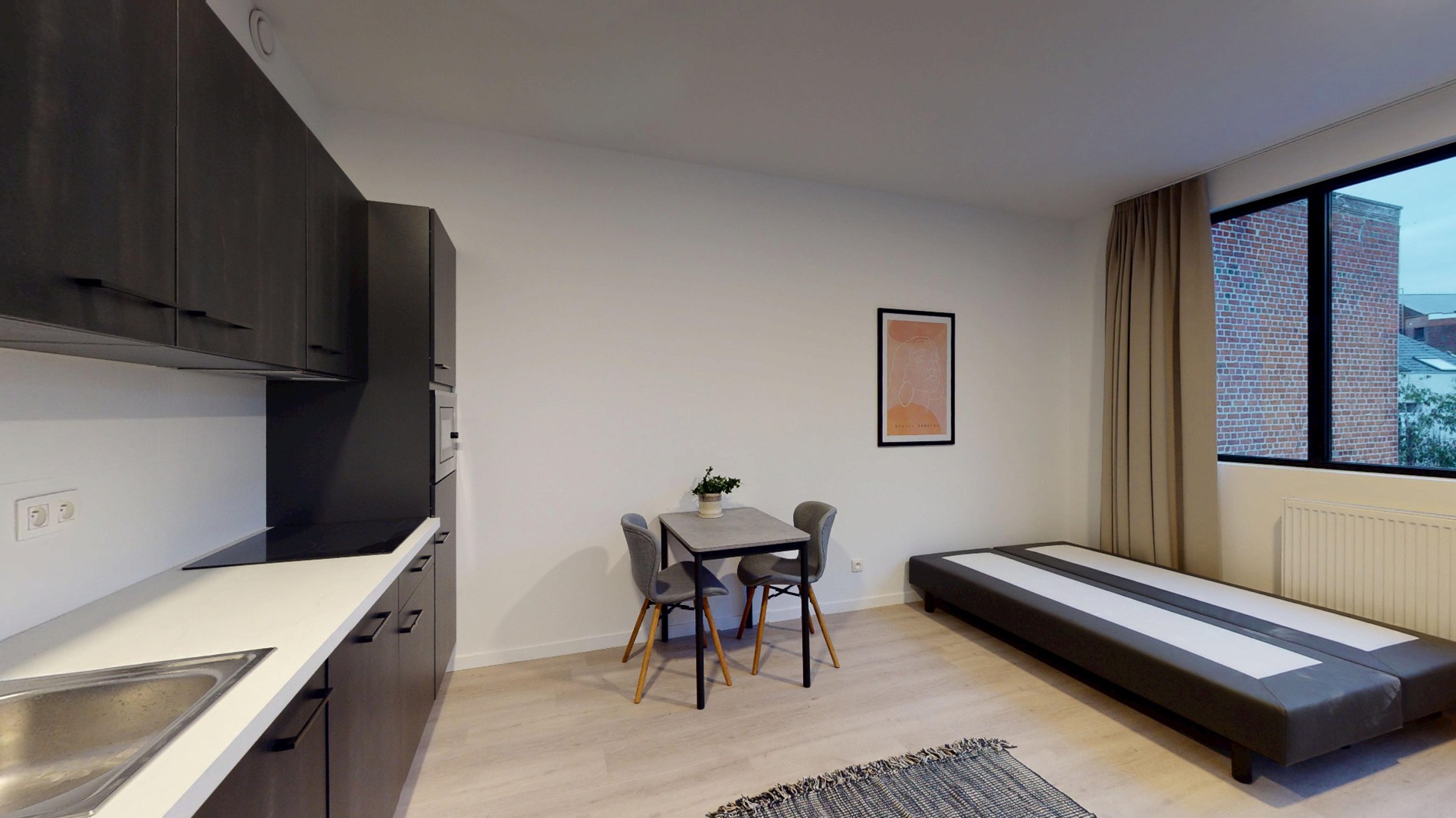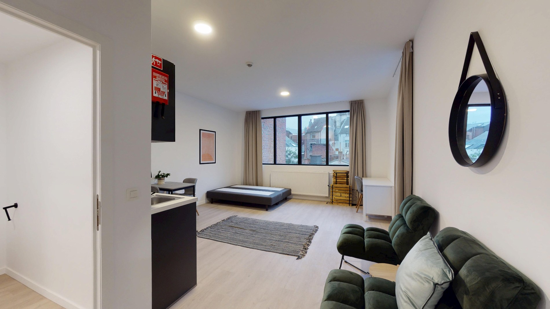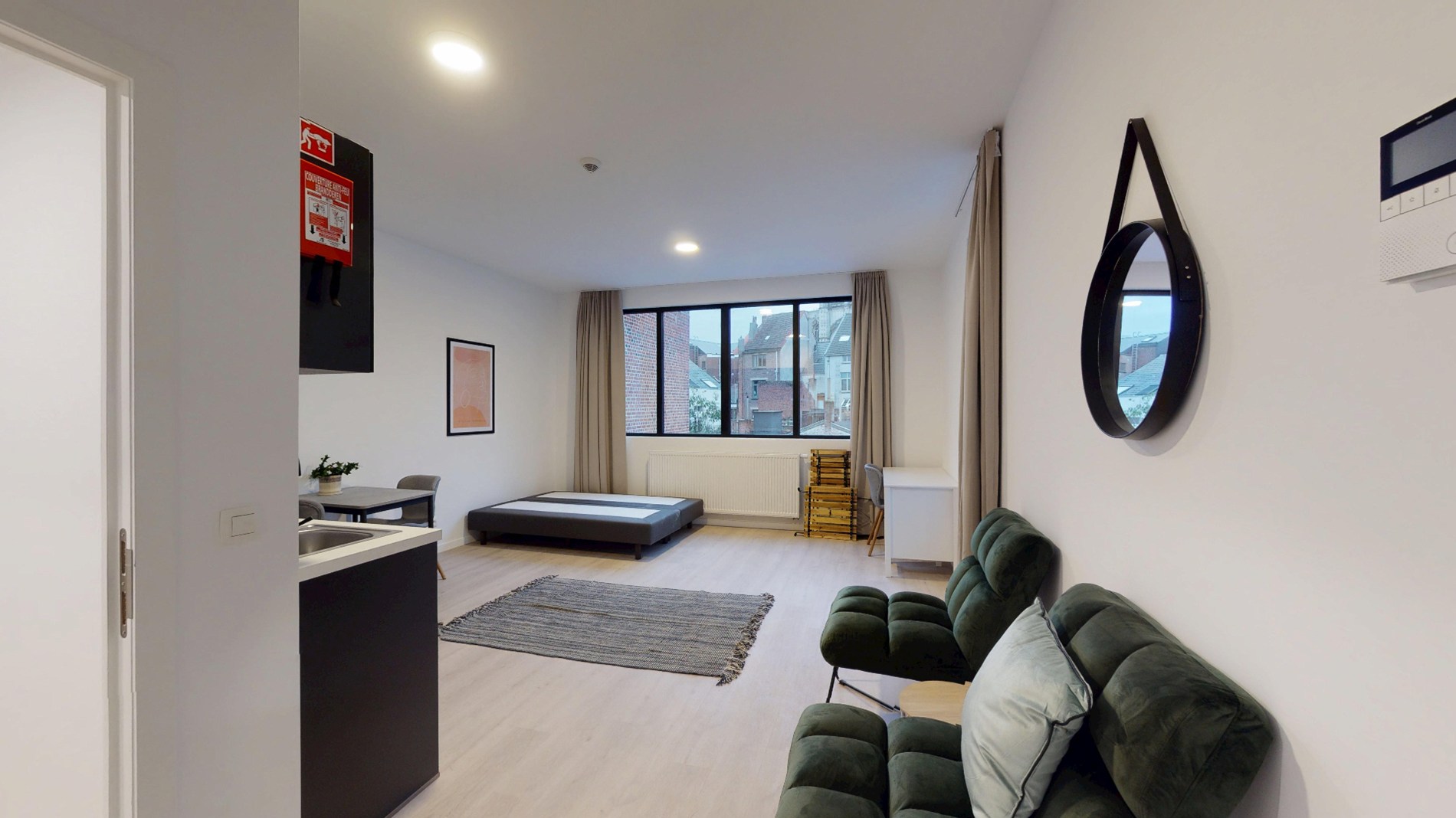 De studio is smaakvol ingericht en voorzien van alle nodige voorzieningen voor een comfortabel verblijf. De open woonruimte is voorzien van een gezellige zithoek, een eethoek en een volledig uitgeruste keuken met moderne apparatuur. De grote ramen zorgen voor veel natuurlijk licht, wat de ruimte nog ruimer doet ogen.