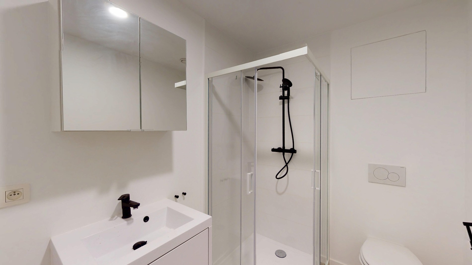 De badkamer is modern en uitgerust met een inloopdouche, wastafel en toilet.
