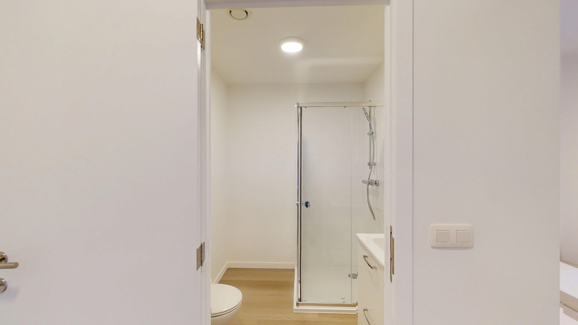 De badkamer is voorzien van een lavabo, een toilet en een douche.